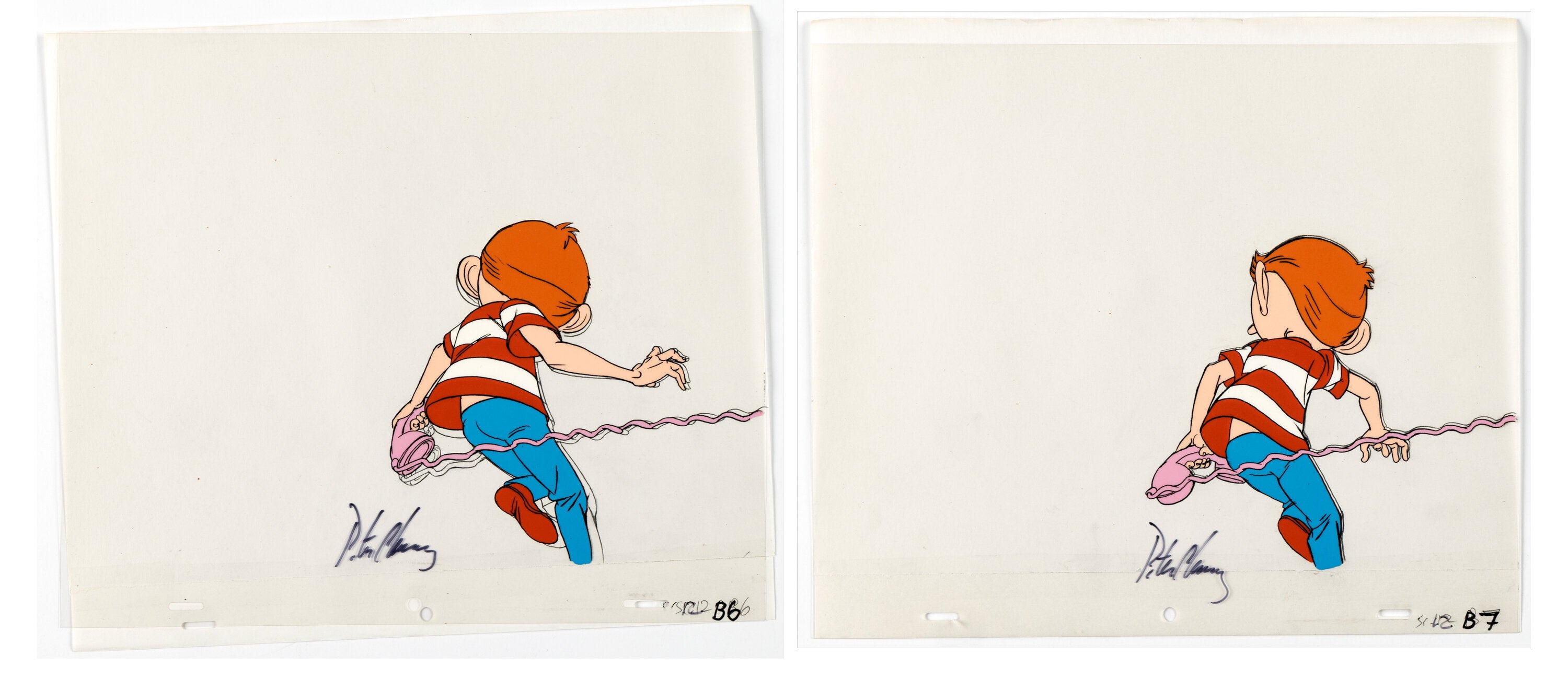 Plus abouti, ce dessin est utilisé directement dans le film. Chaque mouvement ou expression passe par plusieurs de ces dessins, numérotés et placés dans l’ordre de l’animation. Un fragment du film original.