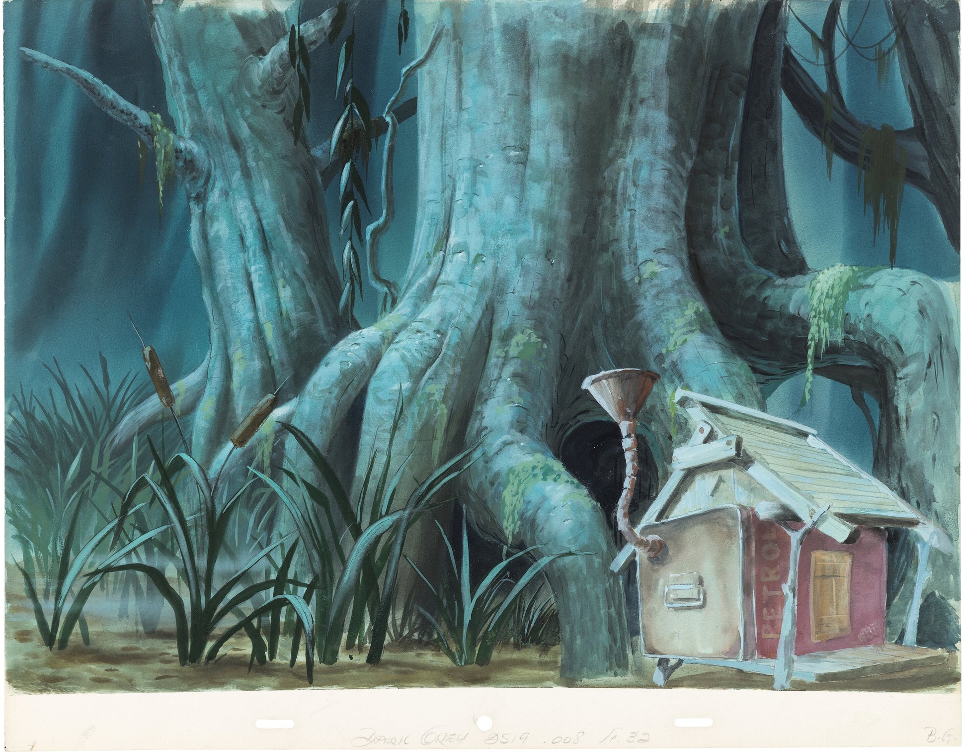 Il y a quelque chose d'hypnotique dans ce marais. James Coleman (color stylist, héritier direct de la grande tradition des backgrounds Disney) a imaginé ce décor avant même que le film ne commence à s'animer. Le cyprès centenaire, la petite maison construite autour d'un bidon, la lumière glauque du Devil's Bayou : tout est là, peint à la gouache, sur un seul board 16-field. Provenant directement de sa collection personnelle, c'est une pièce qui raconte autant l'histoire du film que celle de ceux qui l'ont fait.